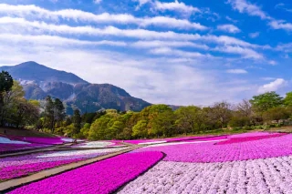 羊山丘陵の斜面に沿って、色とりどりの鮮やかな芝桜を組み合わせて植裁されており、まるで絨毯のように見事な模様が浮かび上がる。武甲山を背景に、ピンクや白、薄紫など、さまざまな品種の芝桜が一面に敷き詰められた光景は圧巻で、まさに『“花のパッチワーク”』のよう。