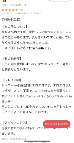 口コミのお礼のメッセージ遅くなっちゃいました