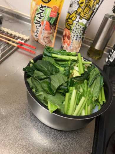 キャベツや小松菜はかさが少なくなるから多いくらいがちょうどいいのよ