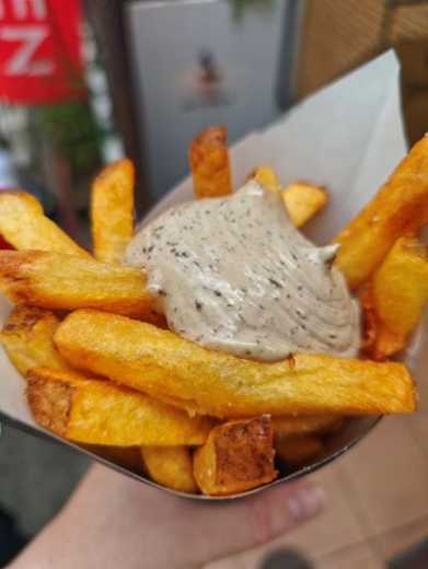 外カリカリで中がホクホクの厚切りポテト…これが想像以上に美味しくてびっくりでした🤤✨揚げたてポテトにトリュフマヨネーズが非常に美味(最高)名物の ステック&フリッツ(ステーキ+ポテト) も頼んでみたんですが、お肉とポテトの組み合わせが最高すぎる。