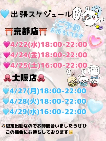 今回も大阪店と京都店の2店舗へ出勤させてもらいます🍀*゜