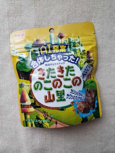 写メはきのこの山とたけのこの里が1つになったお菓子です