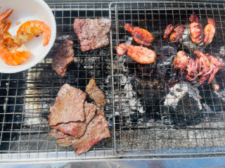 ただ…暑すぎて、お肉が焼ける前にミンの腕が焼けちゃいそうでした?