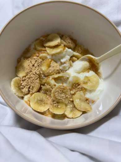 バナナとヨーグルトときな粉と蜂蜜とオートミールを入れたやつ!